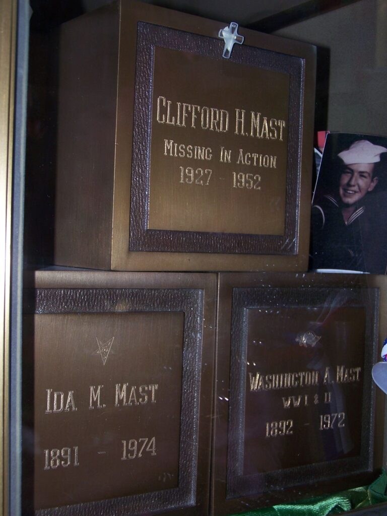 Staff Sergeant Clifford Henry Mast’s name is inscribed on the Courts of the Missing at the Honolulu Memorial and is memorialized at the Korean War Veterans Memorial in Washington, D.C. He also has a memorial marker at Riverside Memorial in Spokane, Washington, alongside his parents, Washington Asa Mast and Ida Clifford Mast.