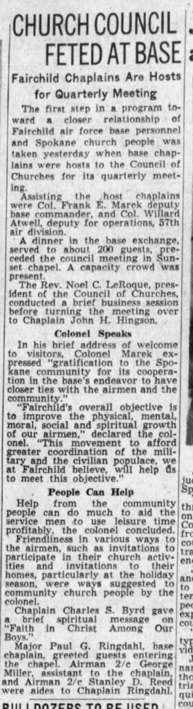 “Church Council Feted At Base.” The Spokesman-Review [Spokane, Washington], December 1, 1952. Newspapers.com (569578537).