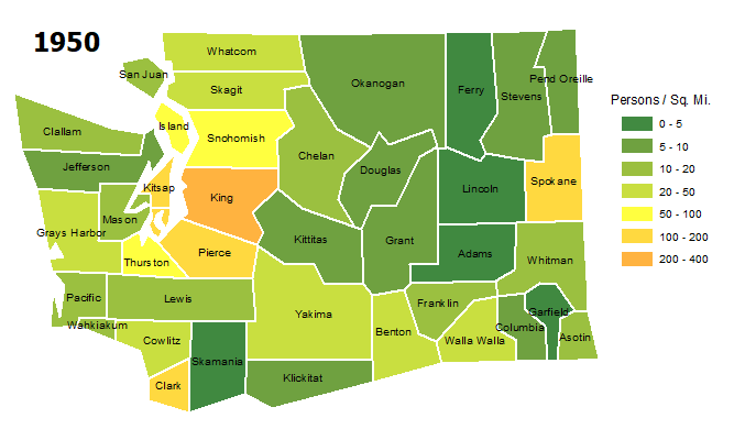 Population density map of Washington State’s 39 Counties in 1950. Washington State Office of Financial Management.