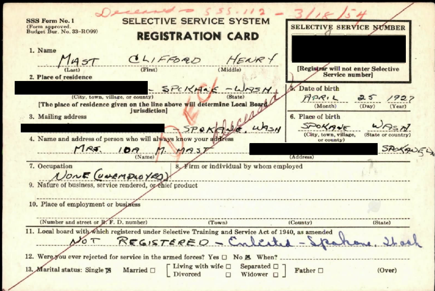 Clifford Mast’s Korean War draft card, signed September 2, 1948 (front of card). Portions have been redacted for privacy reasons. National Archives and Records Administration.