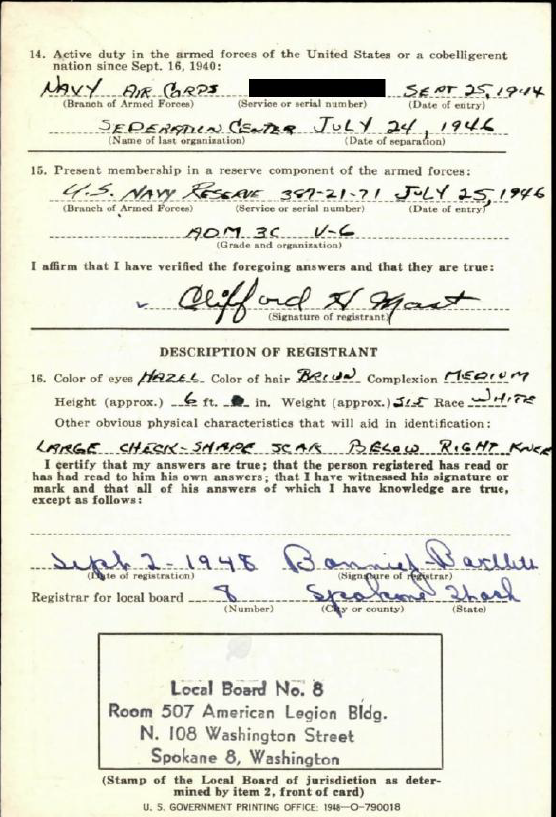 Clifford Mast’s Korean War draft card, signed September 2, 1948 (back of card). Portions have been redacted for privacy reasons. National Archives and Records Administration.