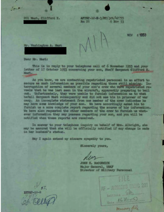 . . . after the cessation of the Korean hostilities and upon the receipt of statements from the 11 surviving members of Mast’s B-29 who were repatriated (with SSgt Clifford Mast being the only crew member unaccounted for) the returnees [statements] reveal that your son was last seen by them in the aircraft, apparently preparing to bail out. They are unable to furnish information as to what befell him after that time. An incomplete statement from one crew member indicated that he may have had further knowledge of Sergeant Mast, but, regrettably, upon interrogation it was disclosed that they had nothing to add to his report which would assist in establishing the exact fate of your son. Though his name was included on the list presented to the Communists for an accounting, no report concerning him has been forthcoming from them or from any official or unofficial source which would establish his ultimate fate.