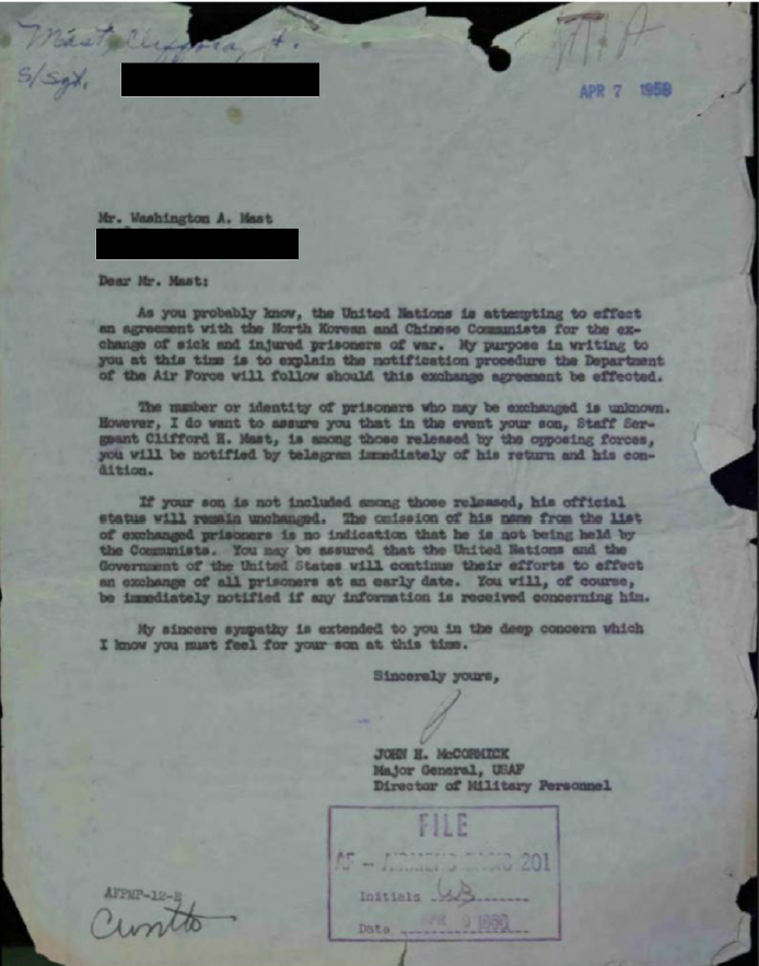Letter from Major General John H. McCormick to Mr. Washington A. Mast, regarding the release of American Prisoners of War by the North Korean and Chinese Communist forces, stated that he would be notified immediately if his son was returned in the prisoner exchange, April 7, 1958. Portions have been redacted for privacy reasons. Official Military Personnel File, National Archives and Records Administration – St. Louis.