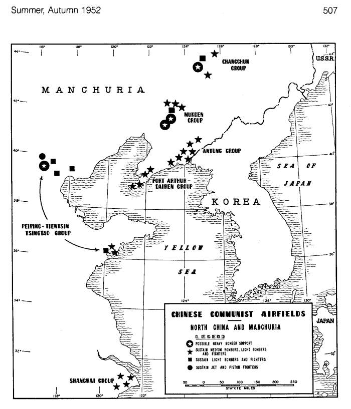 Map of the Chinese Communist Airfields in the summer and autumn of 1952. These were the locations that US Air Force Surveillance Squadrons were observing. The United States Air Force In Korea 1950-1953.