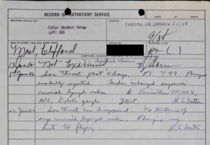 Clifford Mast’s medical record of outpatient service, tracking an illness that affected his ability to fly missions out of the Yokota Air Force Base in Honshu, Japan, June 1952. Official Military Personnel File, National Archives and Records Administration – St. Louis.