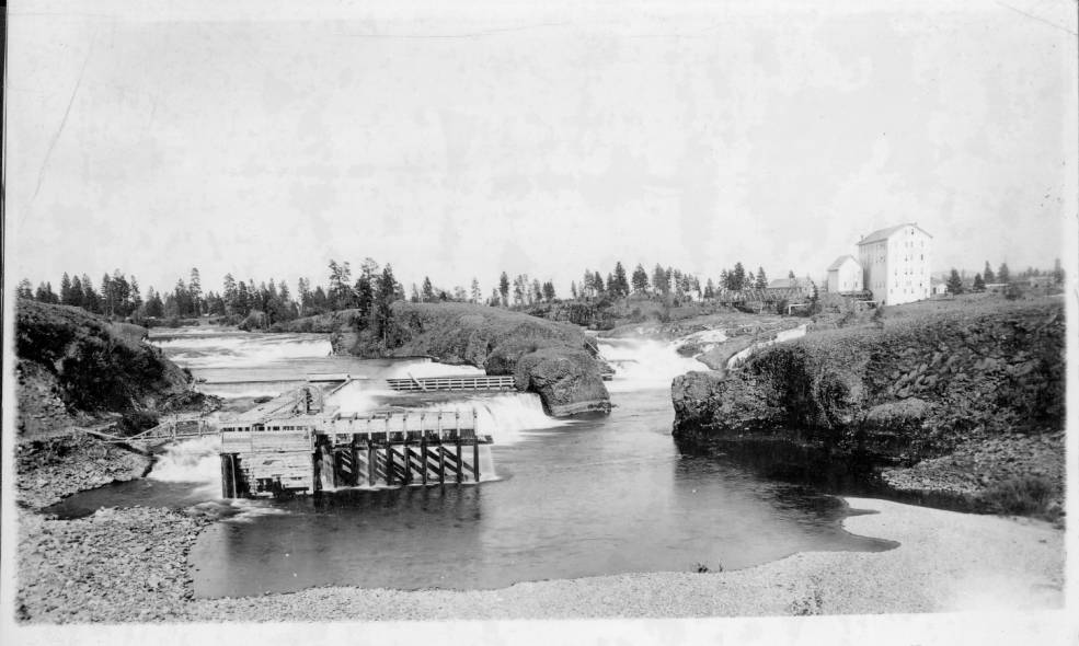 Spokane Flour Mills on the Spokane River, in downtown Spokane, Washington, c.1885. Teakle Collection, Spokane Public Library.