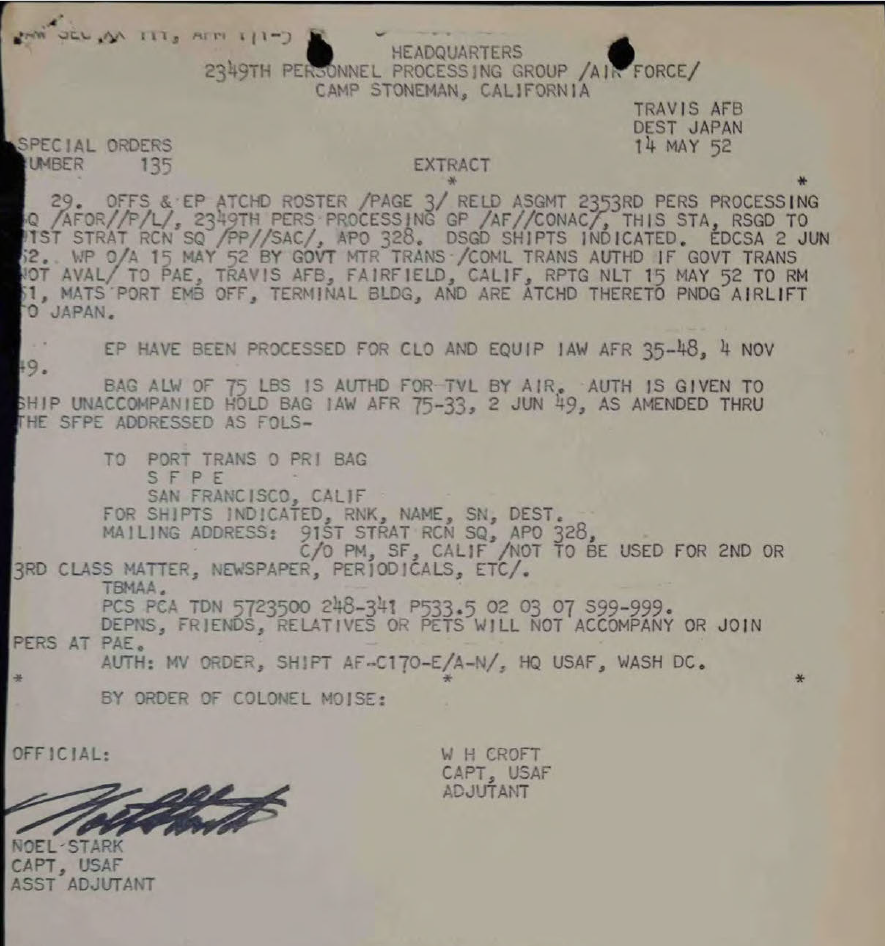 Clifford Mast’s overseas orders to depart California for Japan to join the 91st Strategic Reconnaissance Squadron during the Korean War, May 14, 1952. Official Military Personnel File, National Archives and Records Administration – St. Louis.