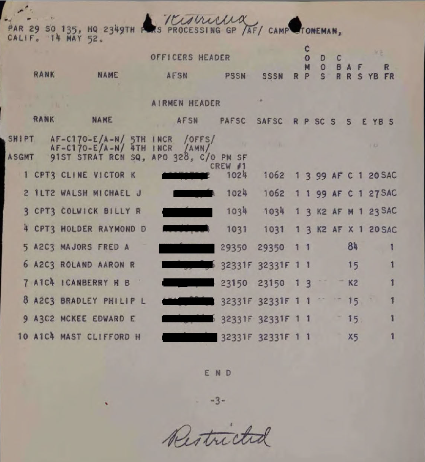 On May 3, 1952, Mast was notified that he was selected for an overseas assignment. By May 18, Mast arrived at Travis Air Force Base in California, awaiting transport to Japan. Special Orders No. 135 listed Airman First Class Clifford H. Mast as one of the ten members of a crew reassigned to the 91st Strategic Reconnaissance Squadron, stationed in Japan. This reassignment included orders authorizing access to classified materials requiring a TOP SECRET security clearance.