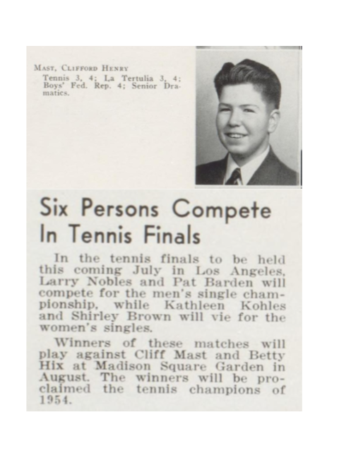 He was also an accomplished athlete, playing on the tennis team each year during high school. In his senior year, Clifford represented the Spokane North Central High School men’s singles in a match played at Madison Square Garden in New York City for the 1954 tennis championship.