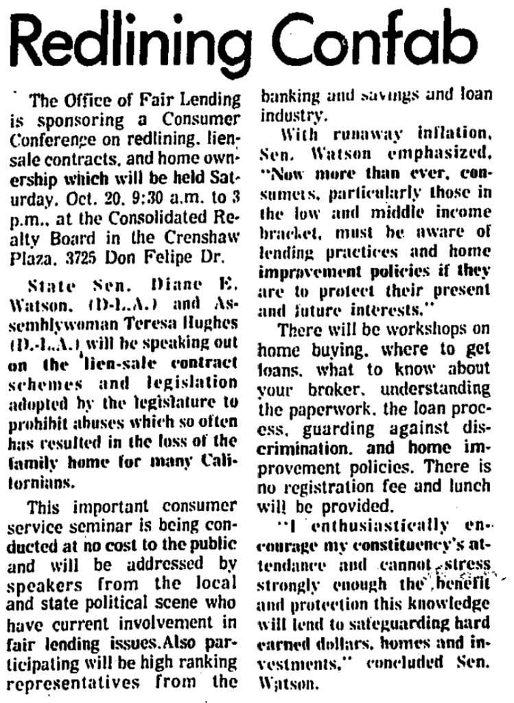 “Redlining Confab.” Los Angeles Sentinel [Los Angeles, California], October 18, 1979.