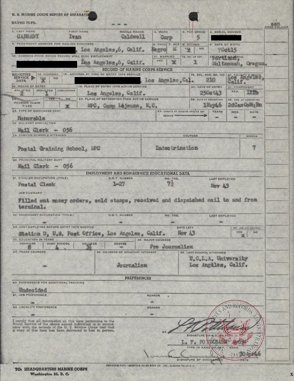 Ivan Cannady enlisted in the United States Marine Corps on October 25, 1943, at Los Angeles, California. He was assigned to the 2nd Marine Headquarters and Service Company, Headquarters Battalion, Montford Point, Camp Lejeune, North Carolina. Montford Point was significant as it was the segregated training facility for America’s first Black Marines. The segregated camp gave African American Marines the opportunity to use their service as a way of showing their capabilities for elite combat and paved the way for full military desegregation.
