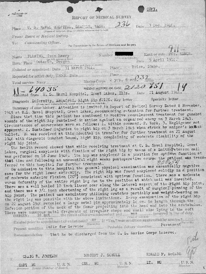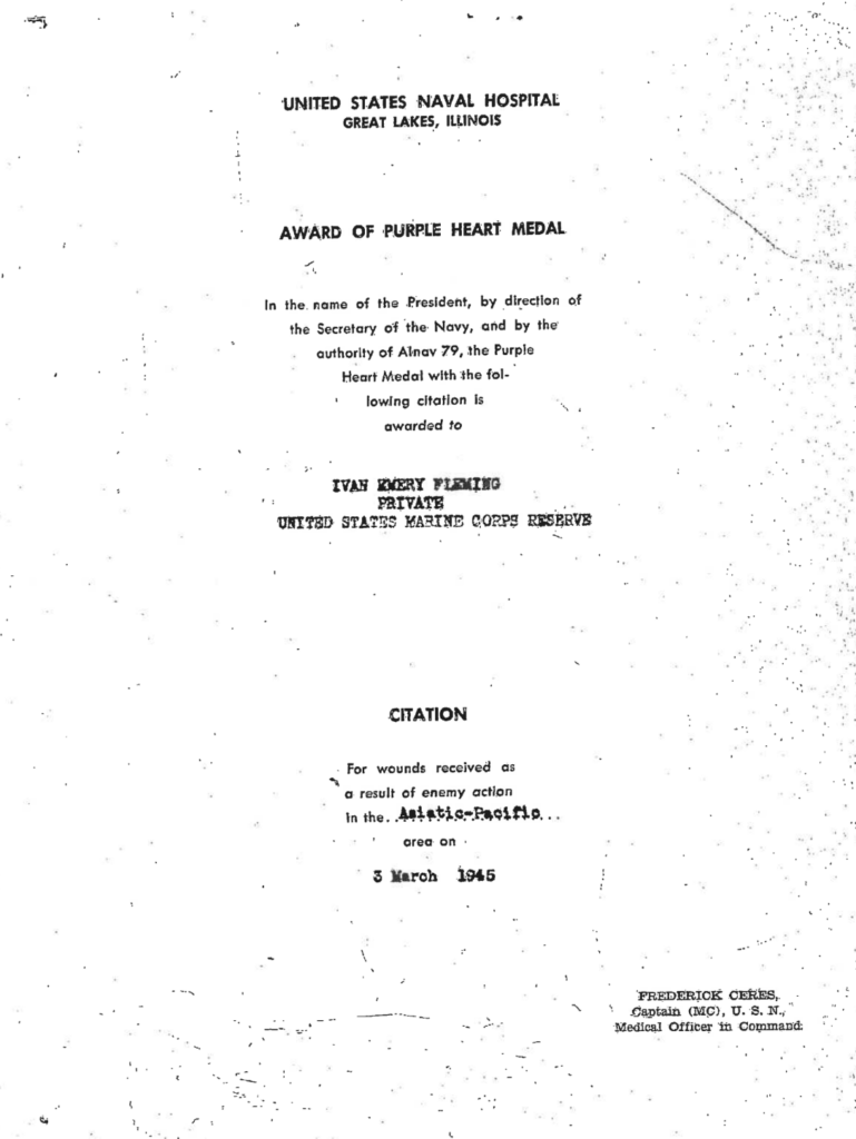Fleming spent the next two years in naval hospitals before finally being discharged and sent home to Boise, Idaho. He was awarded a Purple Heart for the injury he sustained.