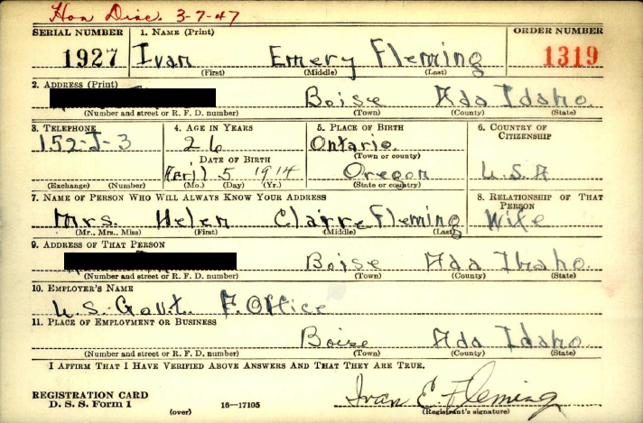 Ivan Emery Fleming. World War II Draft Cards Young Men, 1940-1947. Digital Images. https://ancestryclassroom.com.