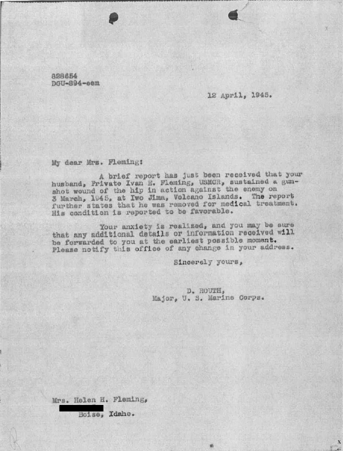 The 4th Marine Division, 24th Marine Regiment, was one of three regiments involved in the assault on Iwo Jima. Iwo Jima was an important location for the Japanese military, and controlling it would give the U.S. military a strategic location for their upcoming invasion of Okinawa. Fleming served on Iwo Jima until March 3, 1945, when he was wounded by a gunshot wound to the leg and evacuated.