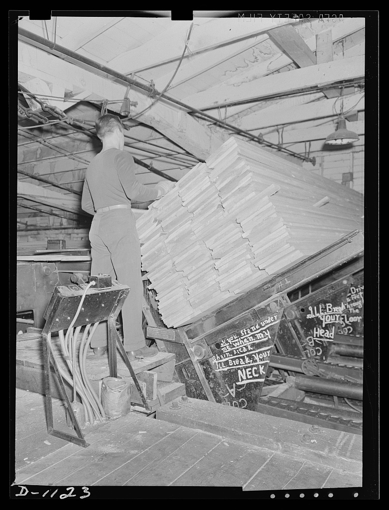 Lumber manufacture. Boise Payette Lumber Company, Boise, Idaho. Semi-finished boards on the automatic unloader which feeds then into the automatic planner for the finished operation. Photograph. June 1941. Library of Congress (2017690059). https://www.loc.gov/item/2017690059/.