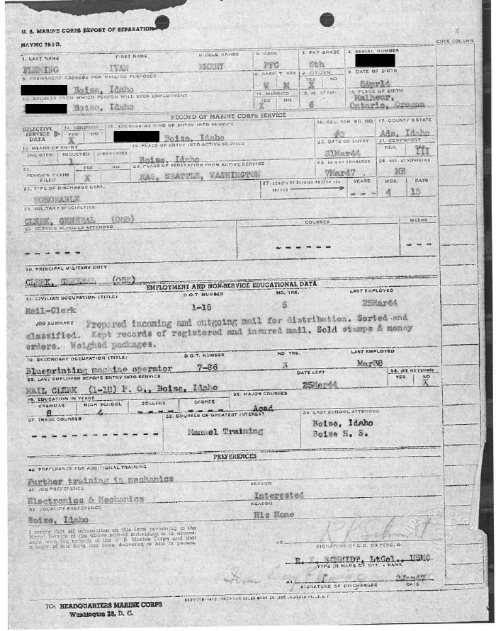 Ivan Fleming registered for the draft on October 16, 1940. His job at the post office most likely deferred his service, but in March 1944, he voluntarily enlisted in the U.S. Marine Corps. He began his training with the 7th Recruit Battalion in San Diego, California. After his initial training, he was sent to Camp Pendleton in Oceanside, California, for additional infantry training.