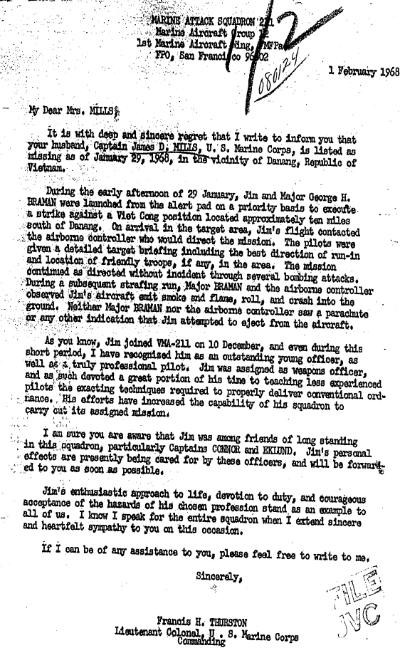 Captain James Dale Mills was 30 years old, with plans to fly commercial planes and return to his wife and daughter in California after the war, when he was deployed to Vietnam. Captain Mills was only in Vietnam for six weeks before he was killed, the day before the Tet Offensive was launched. He was reported to have been conducting air strikes against enemy targets when he was shot down. 1st MAW was a critical force leading up to the Tet Offensive, attempting to disrupt enemy movement and mobilization in the area. The Quang Nam Province in January of 1968 was, therefore, a particularly dangerous place to fly.