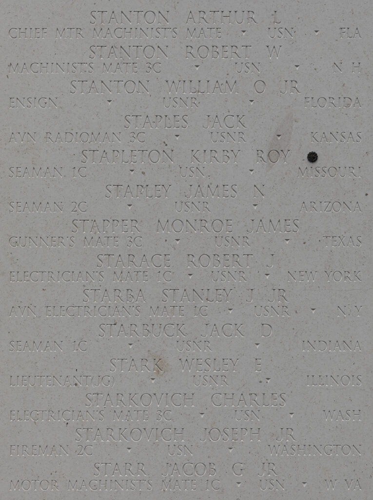 Second Class Seaman James Norman Stapley was lost at sea. His name is memorialized on the American Battle Monuments Commission’s Honolulu Memorial, and his story is told at the Mesa Historical Museum in Mesa, Arizona.