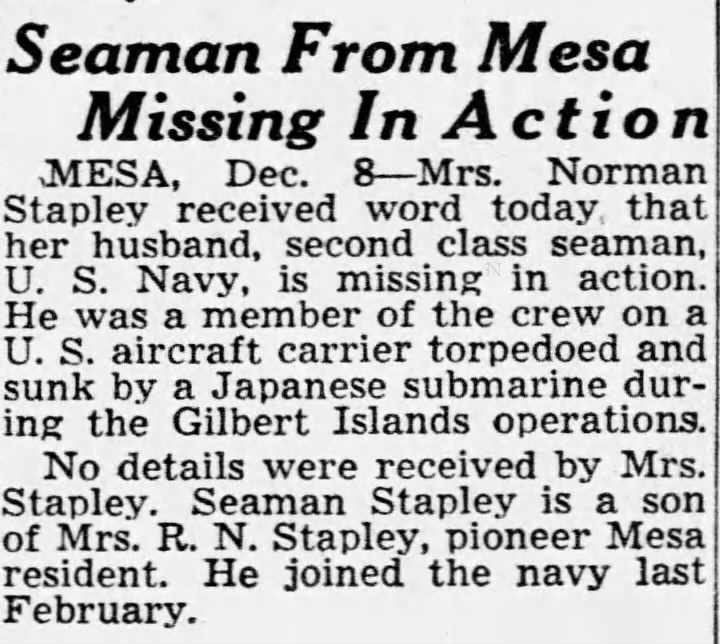“Seaman from Mesa Missing in Action.” The Arizona Republic [Phoenix, AZ], December 9, 1943. Newspapers.com (182100161).