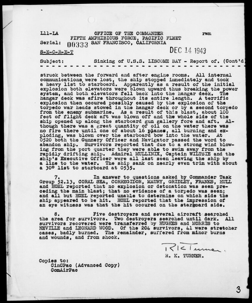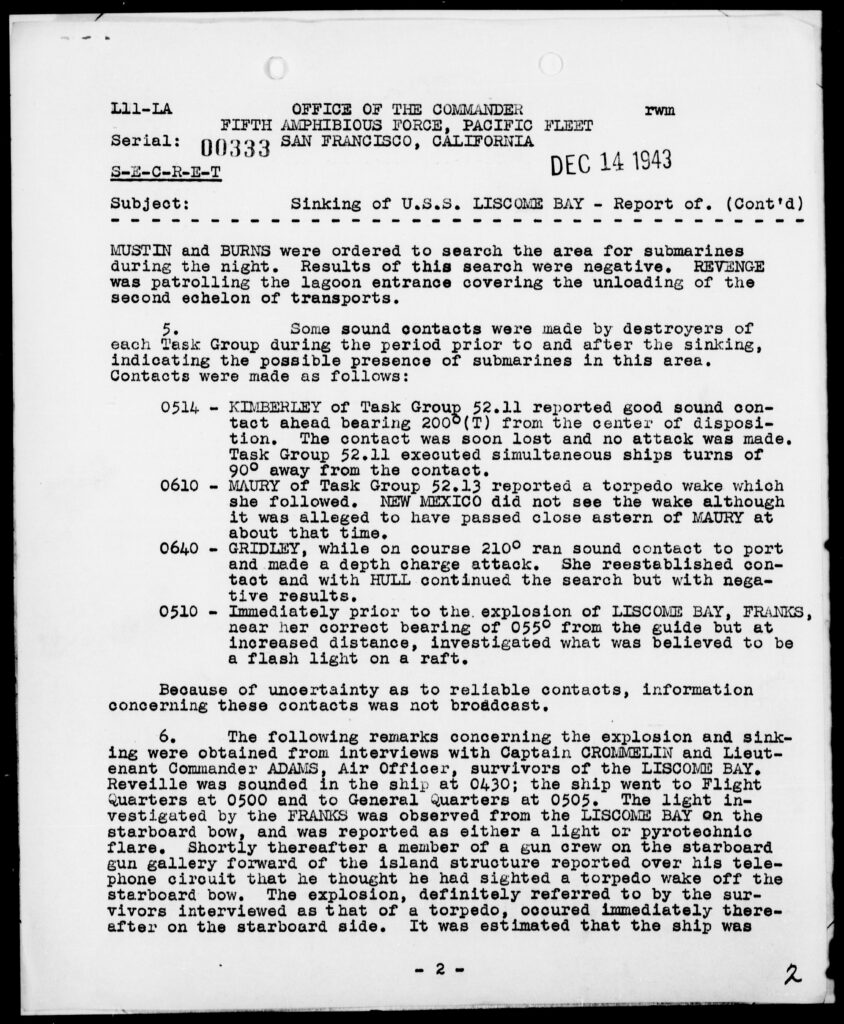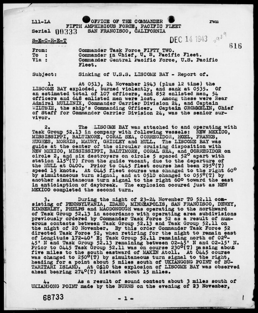 Sinking of the U.S.S. LISCOME BAY. Action Report. November 24, 1943. World War II War Diaries, Other Operational Records and Histories, Records of the Office of the Chief of Naval Operations (RG 38). National Archives and Records Administration (NAID 78360477). https://catalog.archives.gov/id/78360477.