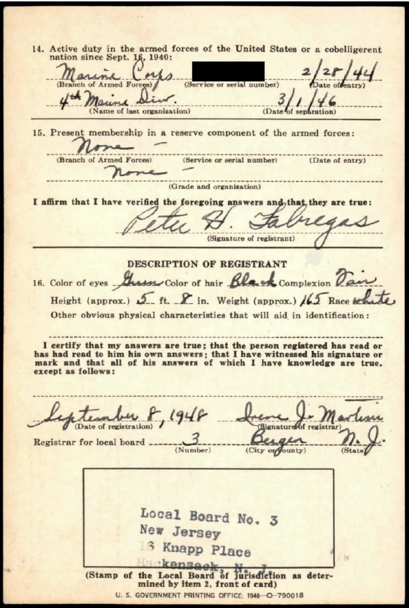 Peter H. Fabregas. U.S., Korean War Era Draft Cards, 1948-1959. Digital Images. https://ancestry.com/.