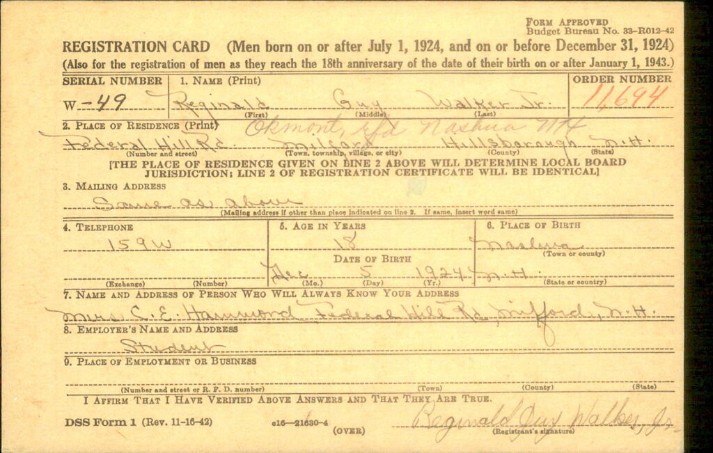 Reginald Guy Walker, Jr. was born on December 5, 1924, in Nashua, New Hampshire. Walker grew up in Milford, New Hampshire, on the Twin Elm Farm of his Aunt Louise and Uncle Claude Hammond. His parents were Reginald G. Walker, Sr., and Edrie Gouin Walker. His father was listed as a metal worker, and his mother died at age 36. He had three brothers and one sister.