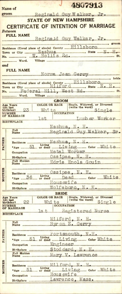 Marriage Certificate of Reginald Guy Walker Jr. and Norma Jean Gerry, September 12, 1948. State of New Hampshire.