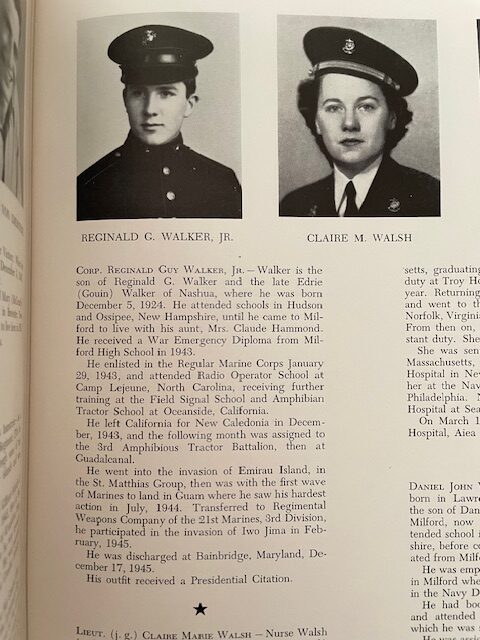 Reginald Guy Walker Jr.’s featured page in a Milford in World War II book published by the town of Milford, New Hampshire. Courtesy of the Milford Historical Society.