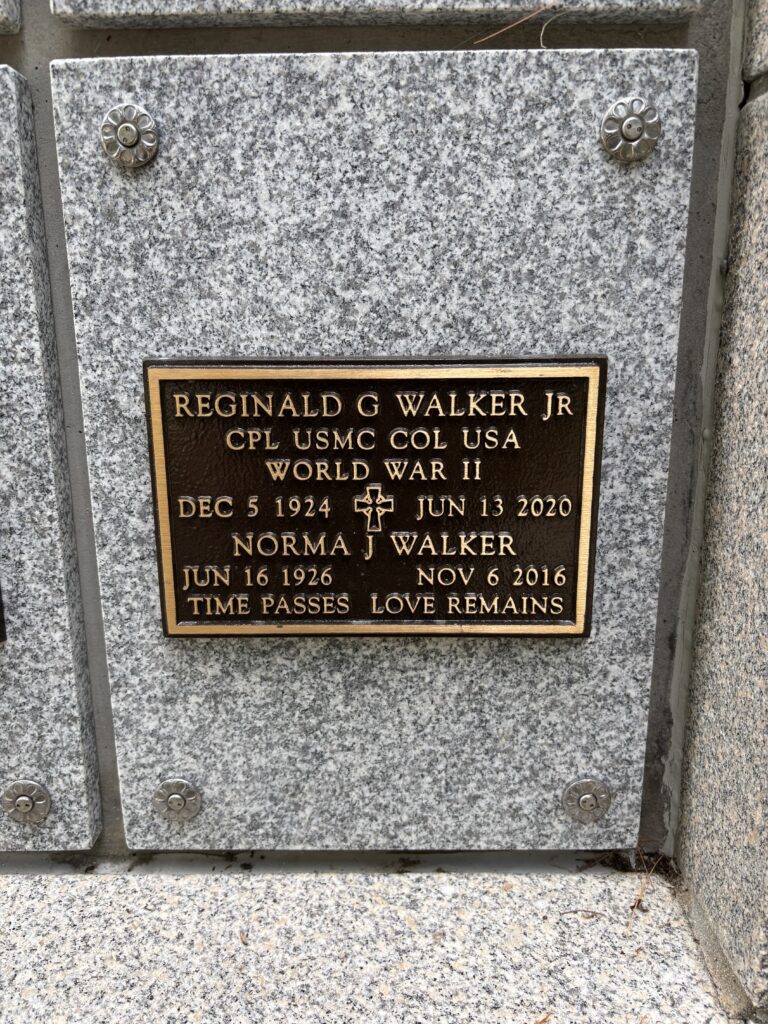 His wife Norma died on November 6, 2016. Reginald Walker passed away on June 13, 2020, and is inurned at the New Hampshire State Veterans Cemetery in Boscawen. Within the cemetery is a beautiful memorial walkway with plaques, statues, and monuments to all American conflicts.