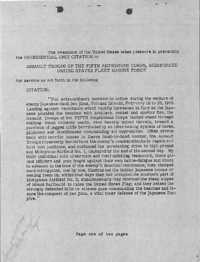 Reginald Walker’s unit received a presidential citation for their action at the Battle of Iwo Jima. Official Military Personnel File, National Archives and Records Administration – St. Louis.