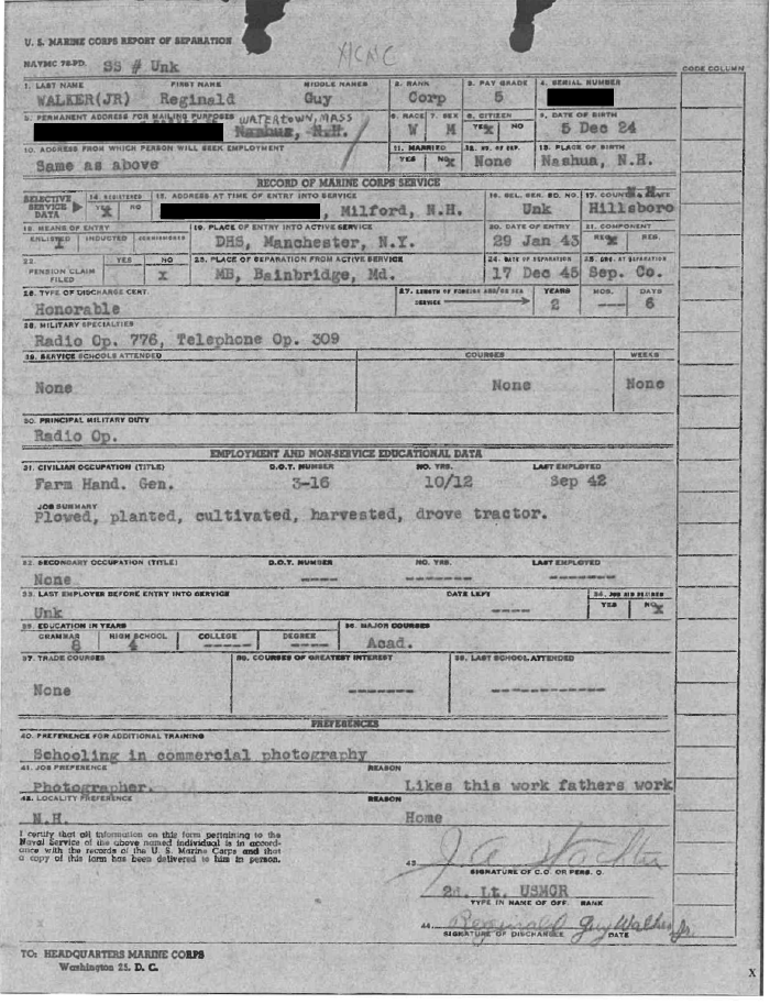 On his Report of Separation, Walker was honorably discharged from the Marine Corps on December 17, 1945. He listed his new permanent address as Nashua, New Hampshire, but it was crossed off, and Watertown, Massachusetts, was written in. His military specialty was as a radio and telephone operator. His civilian plan was to receive additional training in commercial photography.