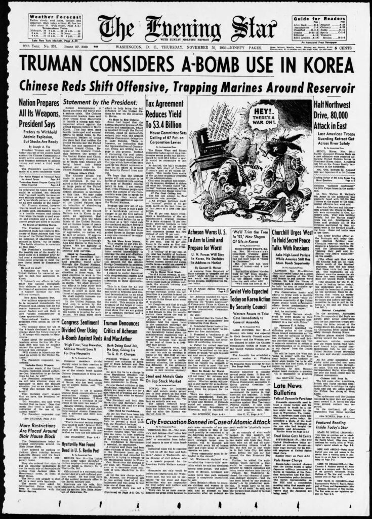 “Truman Considers A-Bomb Use in Korea.” The Evening Star [Washington, D.C.], November 30, 1950. Newspapers.com (868275030).