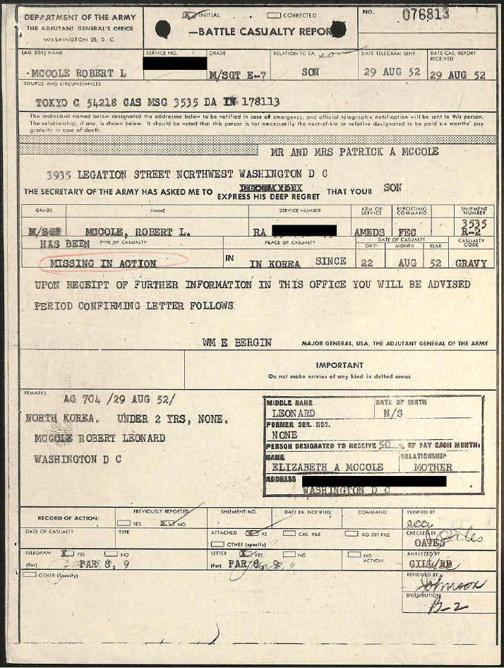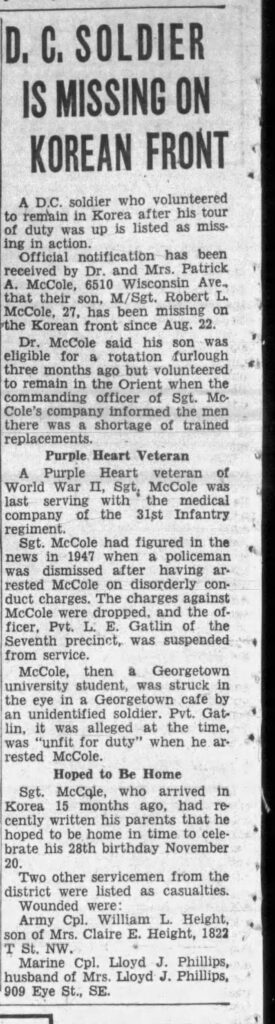 The first public notice of Master Sergeant Robert Leonard McCole’s disappearance appeared in the Times Herald and The Evening Star on September 7, 1952. One article noted that McCole had voluntarily remained in Korea even after his tour of duty ended. The Georgetown University Alumni Magazine listed him among alumni reported as Missing in Action in November 1952.