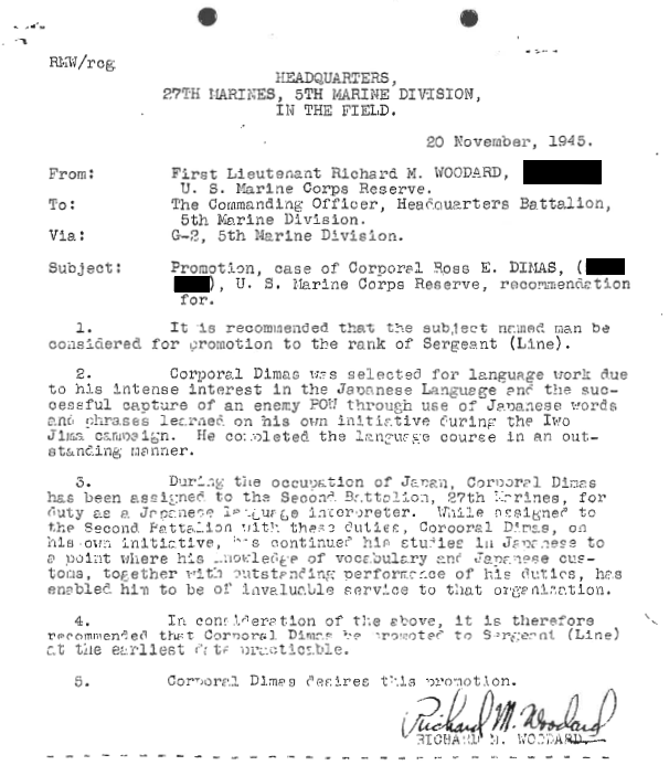 After this training, Dimas traveled aboard the USS Ouster, which left Hawaiʻi at the end of August 1945 and arrived in Sasebo, Kyushu, Japan at the end of September. He then participated in the occupation of the Sasebo area until April 18, 1946, when he was assigned to the 2nd Battalion, 27th Marines, as a Japanese-language interpreter. During his time, Dimas continued to learn the language and customs of the Japanese people on his own, which enabled him to “be of invaluable service to” the U.S. Marine Corps. Because of his work, he was recommended for promotion to sergeant.